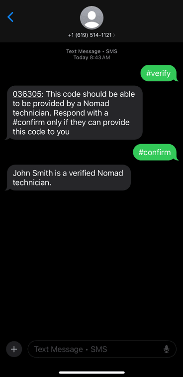 For our clients/end users to verify they are working with an actual Nomad technician, they just need to send an SMS to (619) 514-1121 with #verify, and they will receive a response with a 6-digit code, which the Nomad technician will be able to verify on our side over the phone.
